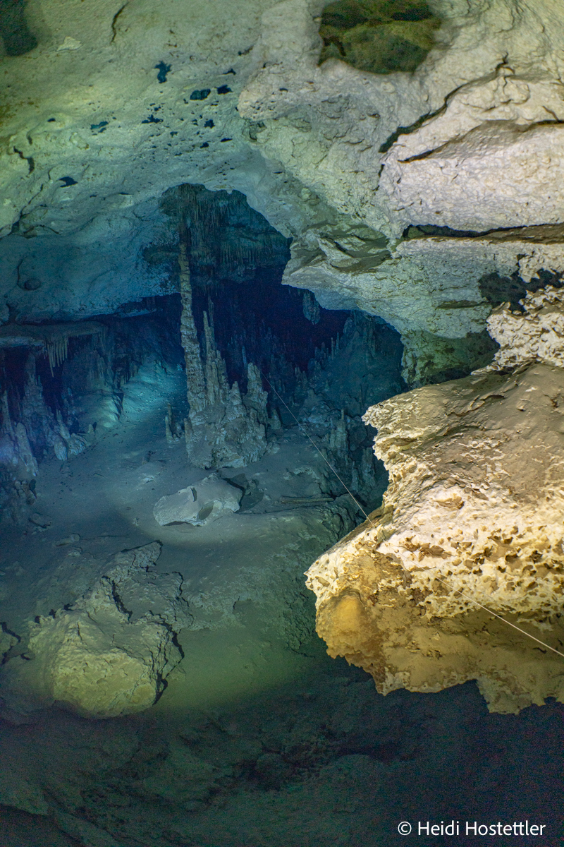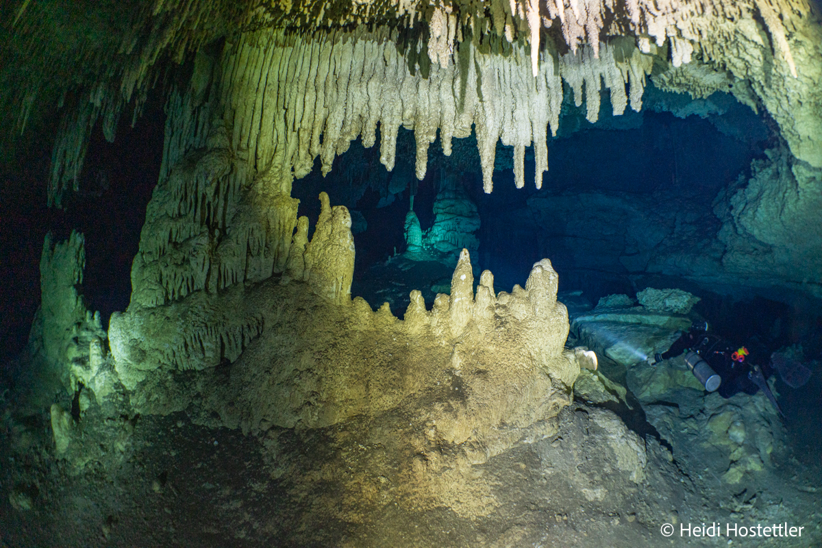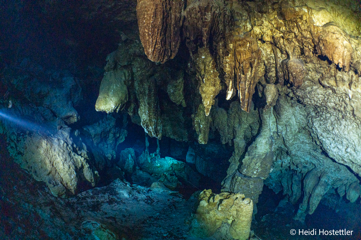 Eine fest verlegte Main Line und – vor allem eine erfahrene Tauch-GuideIn – führt uns durch verwinkelte Höhlengänge und Räume, die mit uralten Stalaktiten und Stalagmiten geschmückt sind, die sich über Jahrtausende gebildet haben.