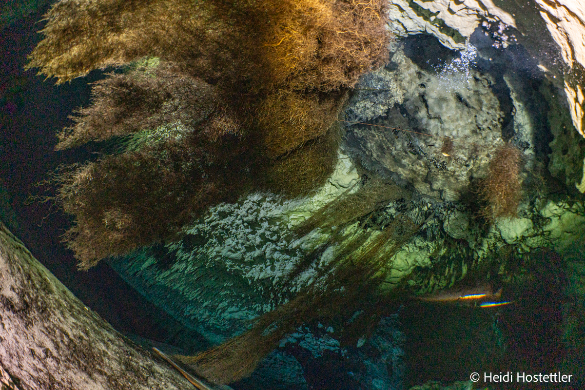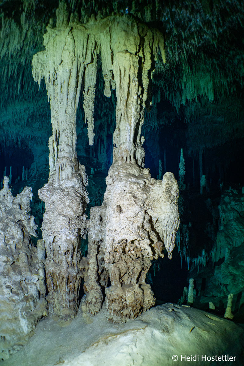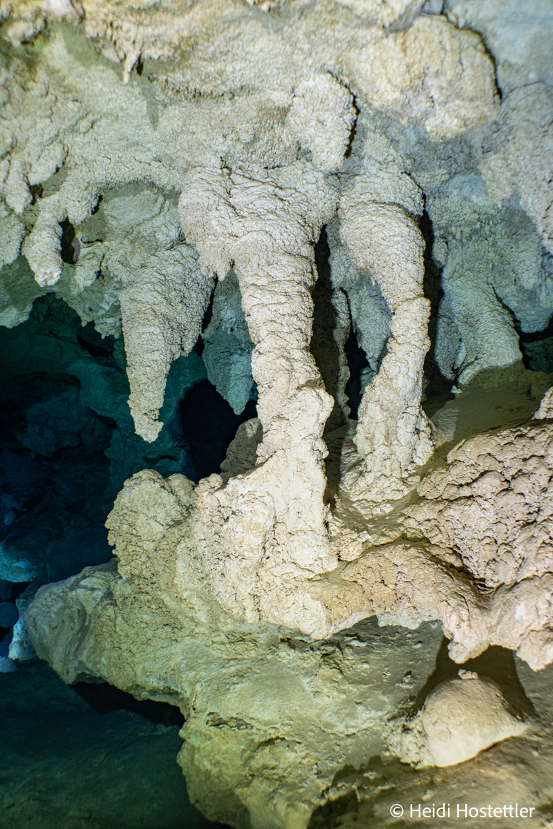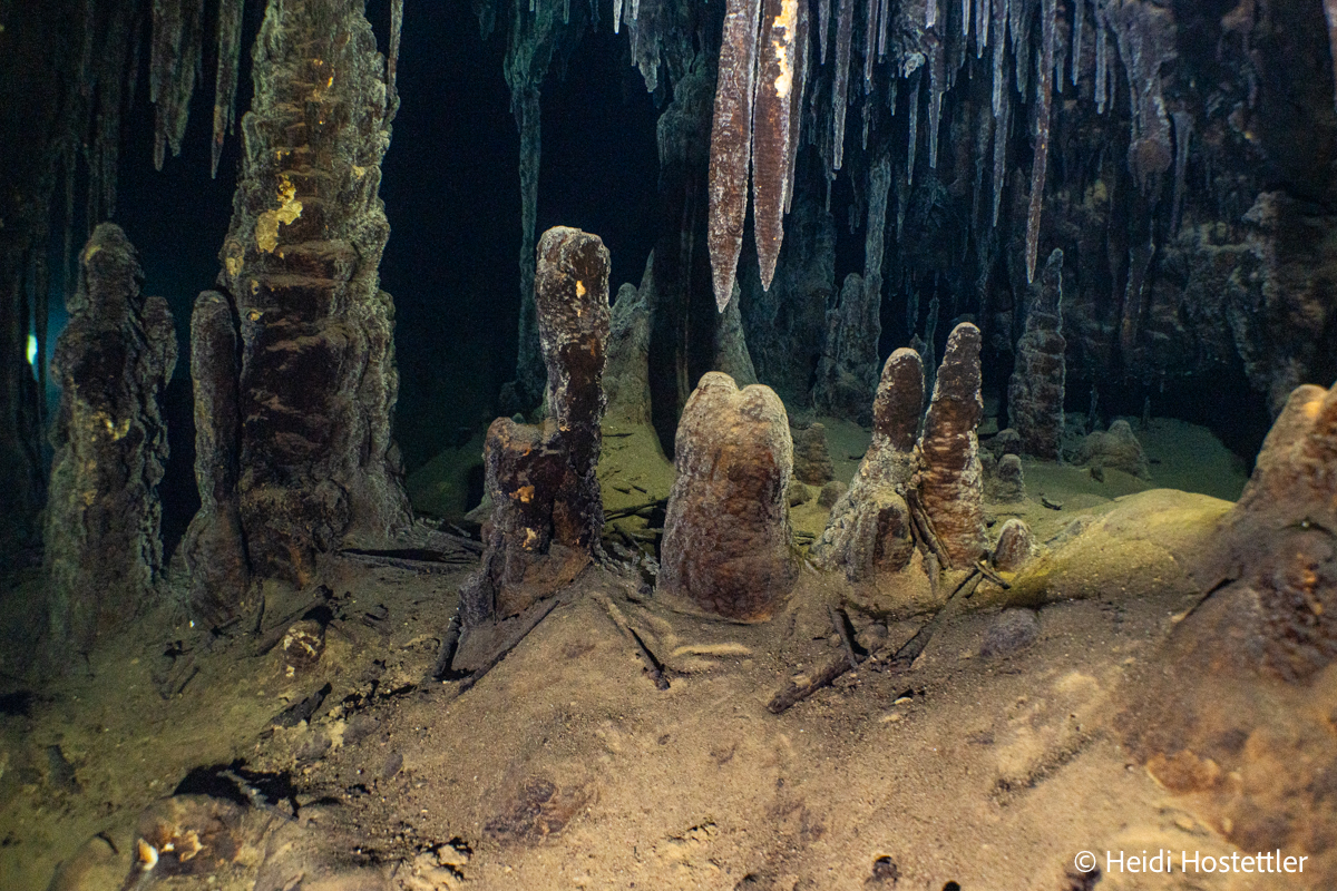 Eine fest verlegte Main Line und – vor allem eine erfahrene Tauch-GuideIn – führt uns durch verwinkelte Höhlengänge und Räume, die mit uralten Stalaktiten und Stalagmiten geschmückt sind, die sich über Jahrtausende gebildet haben.