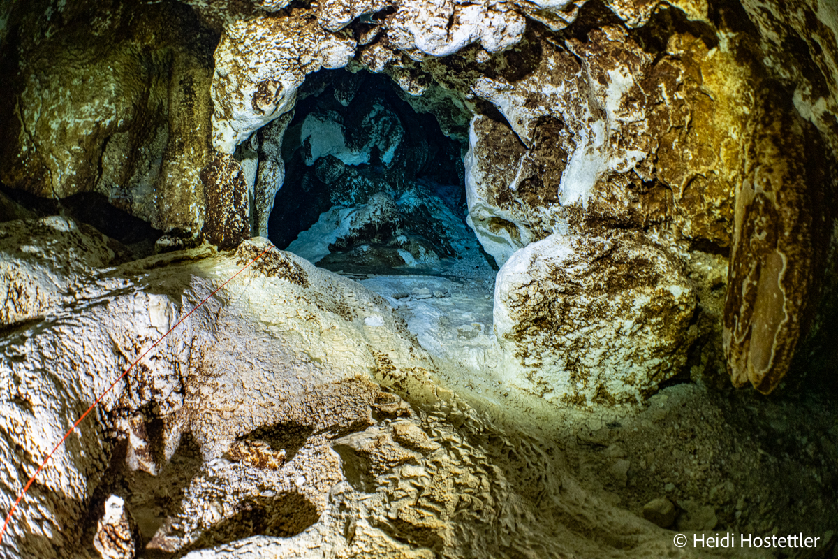 Knochenfunde (Mammut), Keramik und verkohlte Feuerstellen aus der Maya-Zeit zeugen von menschlicher Präsenz, lange bevor sich diese Gänge mit Süsswasser füllten.
